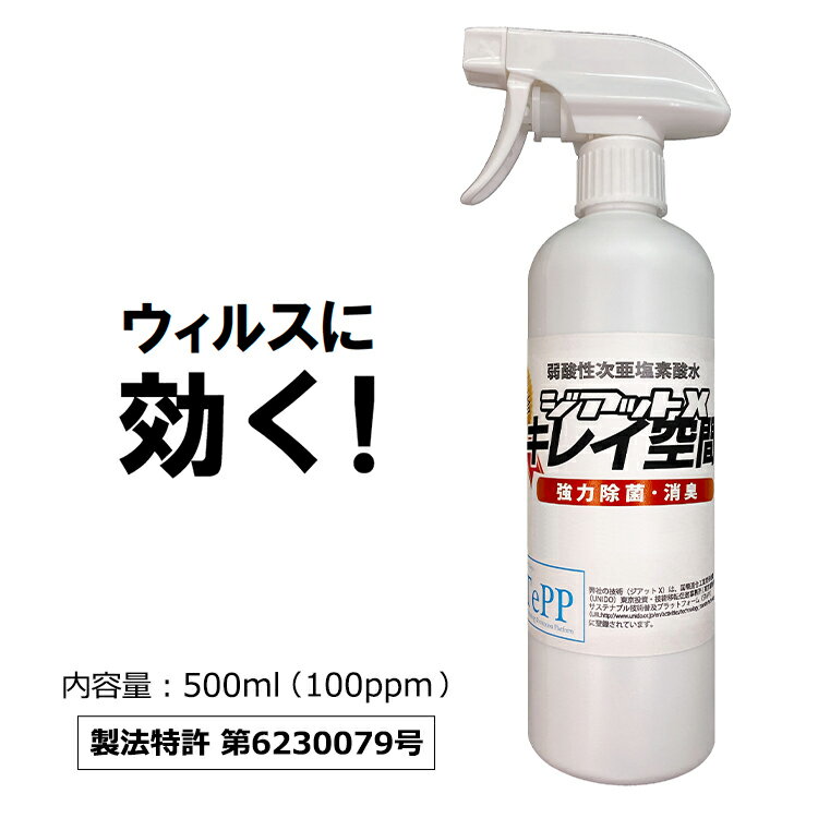 商品名 ジアットX キレイ空間 品名 除菌・消臭剤 主成分 弱酸性次亜塩素酸水 内容量 500ml 使用方法 菌やニオイの気になるところにスプレーしてください。